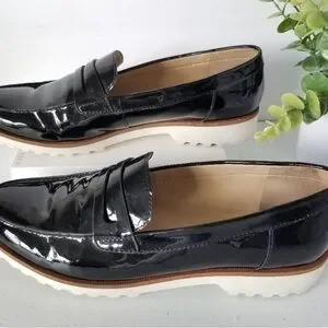 Sleek black patent leather loafers. Stylish and comfortable. Perfect for any occasion. In good used condition