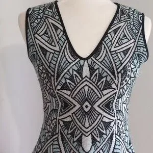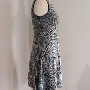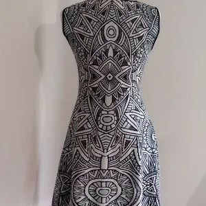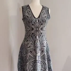 Elevate your style with this stunning & very flattering geometric patterned midi dress. Featuring a sophisticated black and gray design, this dress is perfect for any occasion. Its elegant cut and unique pattern make it a must-have addition to your wardrobe.
