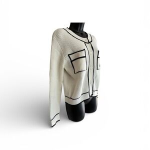 Crisp white knit cardigan with contrasting black trim for a polished look. Features front button closure and two chest pockets. Soft, textured knit that layers easily for everyday wear. Elegant black-edged details elevate your outfit.