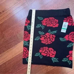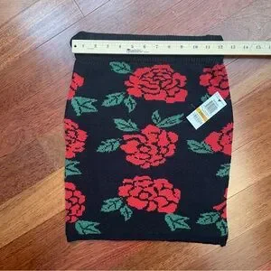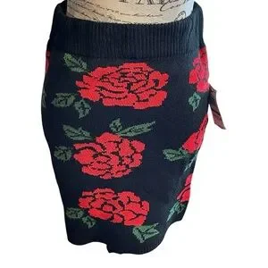 Bold floral mini skirt with striking red roses on a black knit fabric. Ideal for a fashionable look. SKU 592-594