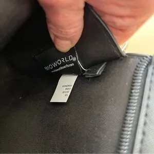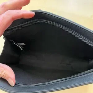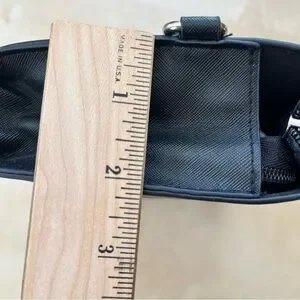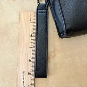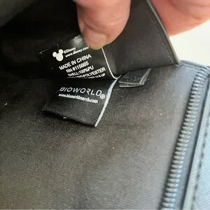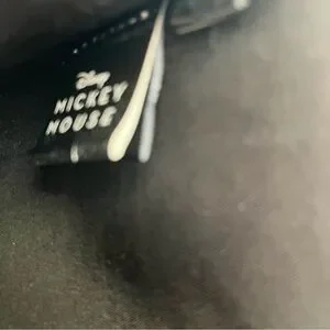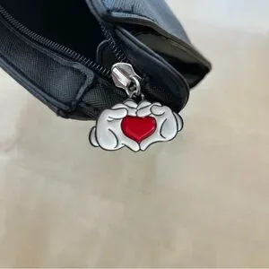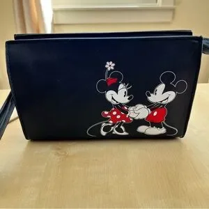 Chic black wristlet featuring Minnie and Mickey holding hands. Red and white graphic details add playful contrast. Zipper closure and detachable strap for easy carrying. Perfect for casual outings or themed events.