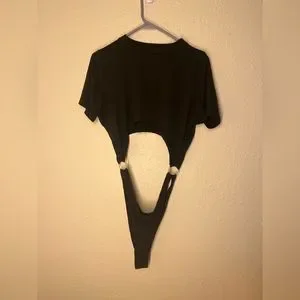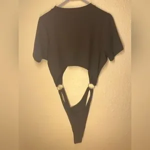Black cropped tee, attached to rings, attached to a high waisted bottom with snaps. No size tag but I believe a XL.