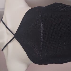 Elegant black halter midi dress with subtle shimmer on the bodice. Features a flattering cutout waist and a sleek, fitted silhouette. Perfect for evening events and special occasions.