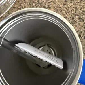 Stanley tumbler with a bold blue finish. Equipped with a durable handle and a clear lid.