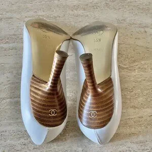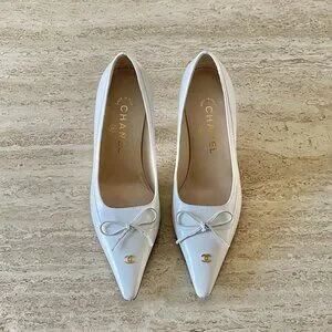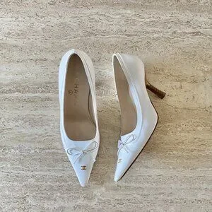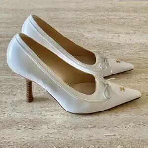Vintage Chanel white leather gold CC bow pointed toe pumps. Size 35.5 C. Perfect bridal heels.