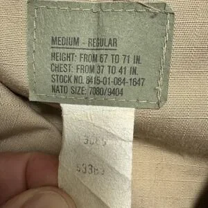 Tag details: Interior size label reading Medium Regular with height from 67 to 71 in, chest from 37 to 41 in, stock no. 8415-01-084-1647, and NATO size 7080/9404.