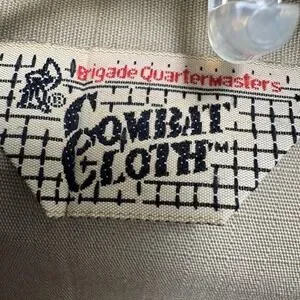 Brand label details: Neck label reading Brigade Quartermasters Combat Cloth with graphic logo.