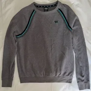 Gray crewneck sweater by Victoria's Secret. Features stylish black and blue stripes. Ideal for everyday comfort.