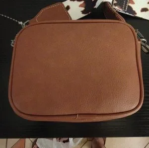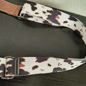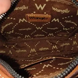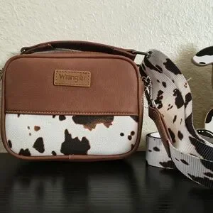 Compact Wrangler crossbody with cow print accent. Brown faux leather body and white panel with brown and black spots. Detachable wide printed strap. Clean, casual silhouette.