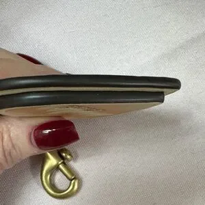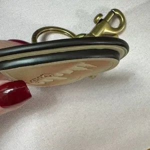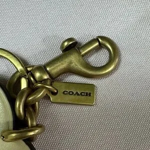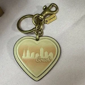 Heart-shaped keyring with signature detail. Features Coach branding. Stylish antique gold and cream design.