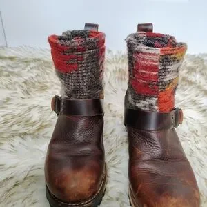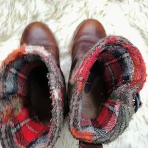 Woolrich branded plaid wool lining. Bold red and heather gray check pattern. Soft textured wool material. Adds warm, rustic detail to footwear or outerwear.