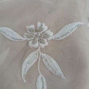 This design stands out for its romantic, delicate, and bohemian aesthetic, ideal for intimate weddings or outdoor events. Cream color, embroidered flowers with glitter. Feel free to contact me with any questions, and I'm open to offers.