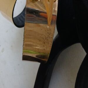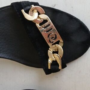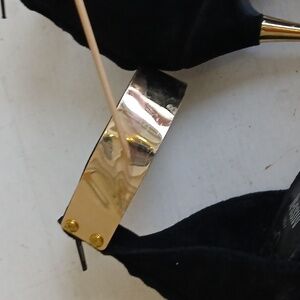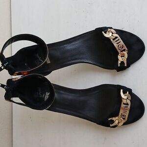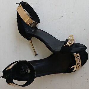 Design: Ankle-strap sandals made of black suede and gold metal.