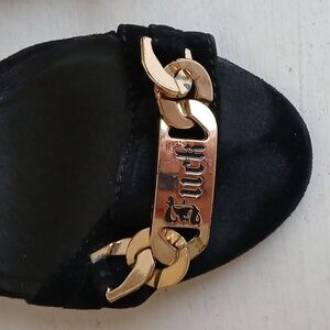 Hardware: Distinctive gold-plated chain-link lettering across the front strap that reads "F*ck" on one shoe and "Off" on the other.