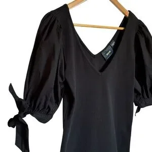 Stylish Maeve by Anthropologie black puff-sleeve blouse featuring a deep V-neckline, soft ribbed knit body, and lightweight cotton sleeves with tie cuffs. Feminine and flattering, perfect for dressing up or down.