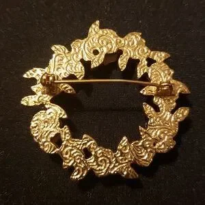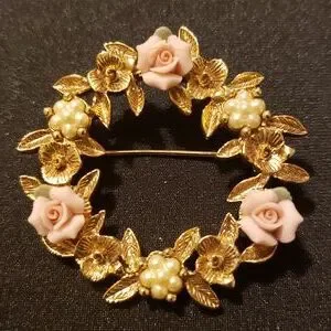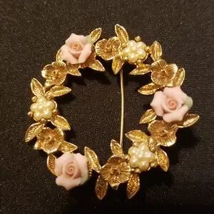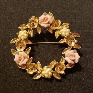 Gold-Tone Pink Porcelain Rose Wreath Brooch.