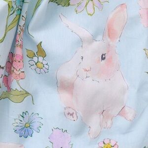 Garden Of Delights! Celebrate the artistry of Inslee Fariss, brought to life through her signature watercolor style! Curious rabbits explore a pastel field of wildflowers in our Botanical Bunnies print shown here on our collection classic Girls Gianna Skirt. A pattern on pattern ruffle at the elastic waist highlights this extra swingy, fully gathered skirt.