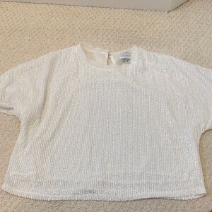 white short sleeve top with full sequin coverage. Lightweight, dressy design that adds sparkle to any outfit. Easy crew neckline for versatile styling. Perfect for evening looks or special occasions.