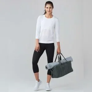 Former lulu employee closet clean-out!! Barely used barrel-shaped duffel bag in a beautiful light green colour. My dog unfortunately chewed part of the handle a bit and price is reflected because of this. Comes with all the accessories! Yoga mat strap, shoe bag, heat-protected hair tool holder! Original price $128