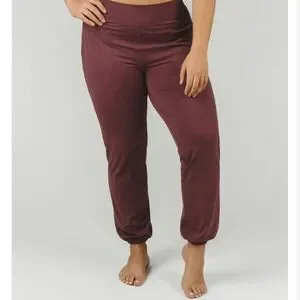 High-rise joggers in a deep maroon shade. Smooth, stretchy fabric for easy movement. Elasticized cuffs and a wide waistband for support. Discreet side pockets for essentials. Versatile for workouts or casual wear.