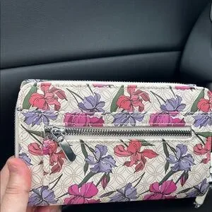 Elegant floral wallet with vibrant pink and purple hues. Perfect for adding a touch of color to any outfit.