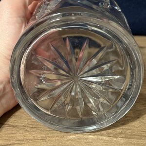 Attractive vintage clear cut glass jar with an ornate gold-tone decorative lid. Ideal for displaying small items or adding classic charm to any room. The gold lid and clear glass create an elegant, timeless look. The lid is heavier than most of the lids that come with this style of jar. The jar itself measures 3 1/2 inches across and 5 1/2 inches tall. With lid it measures 6 inches tall and approximately 5 1/2 inches wide.