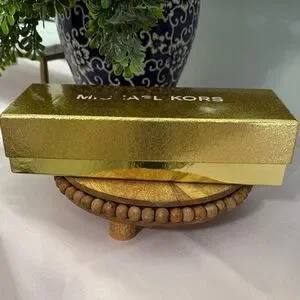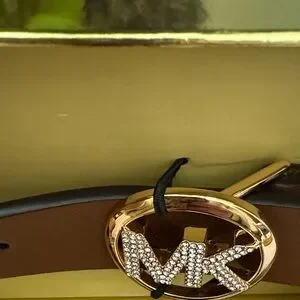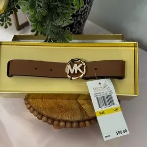 Stylish Michael Kors belt in brown. Features a gold MK logo buckle. Perfect for any outfit.
