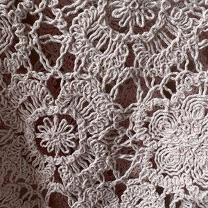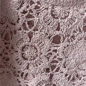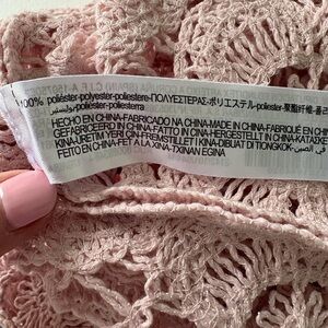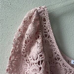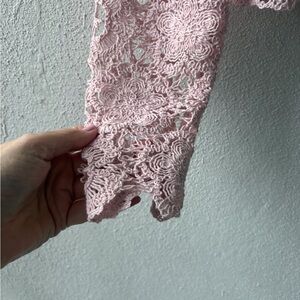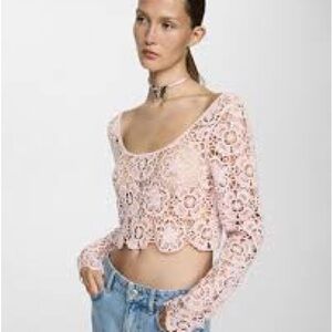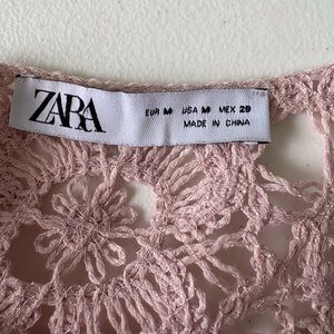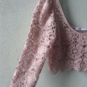 Zara beautiful crochet top featuring long sleeves, scallop hem and a scoop neckline. Floral design in a light pink.