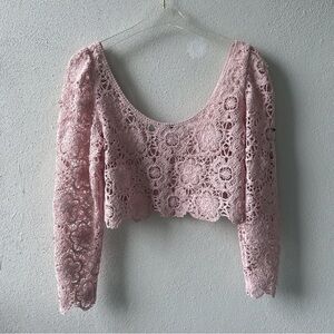 Zara Medium Pink Crochet Crop Top Long Sleeve Boho Scallop Floral Scoop Neckline