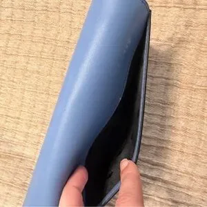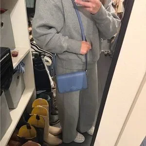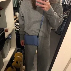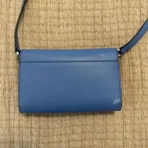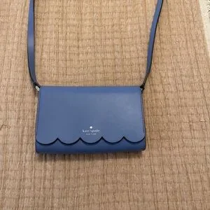 Elegant navy crossbody bag by Kate Spade. Features scalloped edge and sleek design. Perfect for versatile styling. 7.5” by 5”