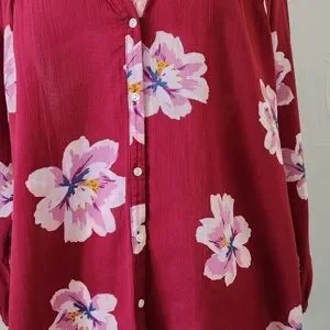 Lightweight burgundy blouse with a pink floral print. Relaxed fit with button-front closure and a gentle V-neck. Soft, flowy fabric drapes comfortably for everyday wear. Machine-washable and easy to style with jeans or skirts.