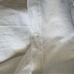 wrinkled, loose threads, fading from wash and wear, pilling from wash and wear, stain on inside of bottom hem