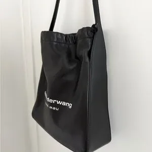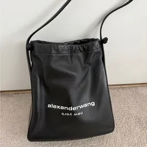 Sleek black leather shoulder bag by Alexander Wang. Drawstring top closure with adjustable strap. White brand logo printed on front. Clean, minimalist silhouette for daily use.