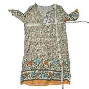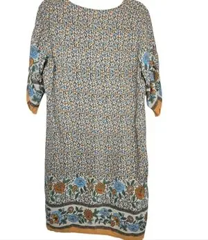 Featuring an orange and cream floral print with blue accents. Its versatile, loose-fitting design allows it to be worn as both a casual mini dress and a beach cover-up.