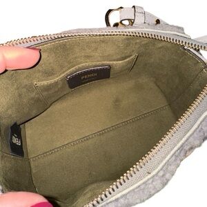 Fendi “By the Way”mini bag in soft light gray shearling. Embroidered Fendi Roma logo on front.