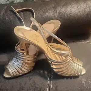 Shiny metallic strappy slingback heels by Christian Louboutin. Multiple slim straps create an elegant woven effect. Classic peep-toe silhouette with a high stiletto heel. Luxurious leather lining and signature red sole detail. Ideal for dressy evenings and special occasions. no box no, dust bag, bought it for an event at poshmark for $300 used once.