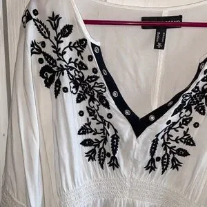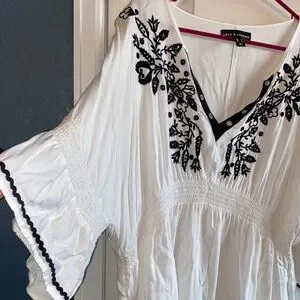 Chic tunic with elegant black embroidery. Soft fabric and stylish design. Perfect for versatile wear.