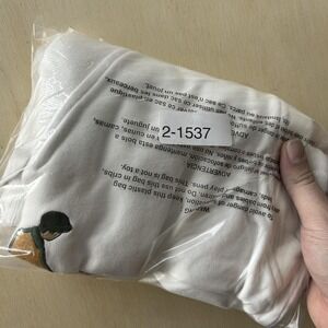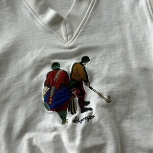 Color: Solid white body with a multicolor embroidered golfer scene on the front.