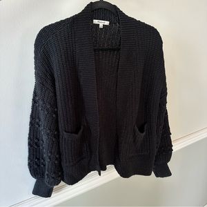 Cozy open-front cardigan from Madewell. Chunky knit with textured bobble sleeves. Deep black color for versatile wear. Soft, warm fabric. Easy to layer over tops and dresses.