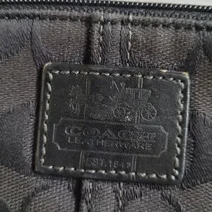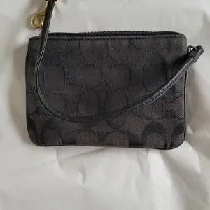 Elegant Coach wristlet with iconic pattern. Features a stylish black and gray design. Perfect for any occasion.