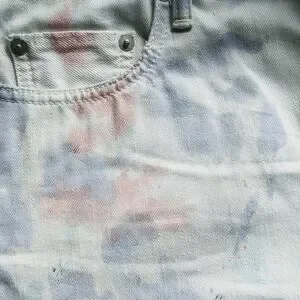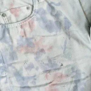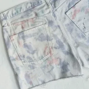 Five-pocket style. Belt loops. Zip fly with button closure. Ripped, raw edge, frayed cut-off hems. Distressing throughout. All over splotchy tie dye print. Denim fabric.