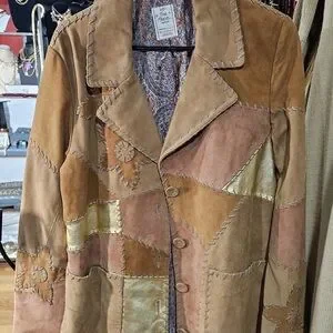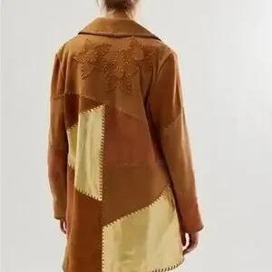 Patchwork suede trench coat with stitched detailing. Button-front closure and large front pockets. Soft suede panels in warm tones. Casual yet refined layering piece.