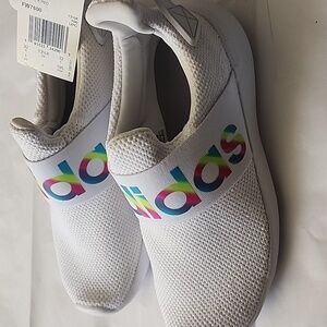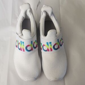 Easy slip-on kids sneakers by adidas. Breathable white mesh upper. Elastic band with colorful rainbow logo. Cushioned sole for daily play. Simple sporty design for casual wear.