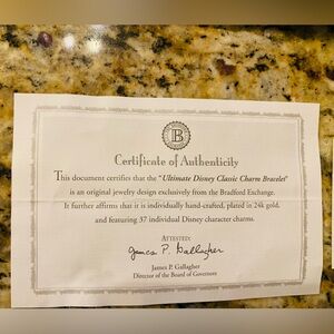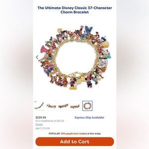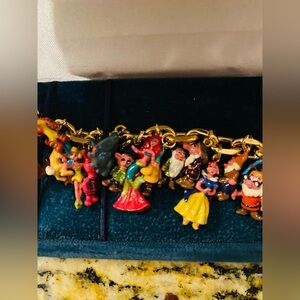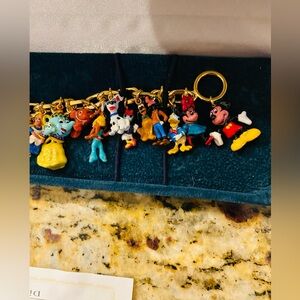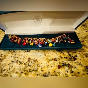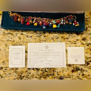 Handcrafted 24K gold-plated brass bracelet featuring 37 fully sculpted, hand-enameled Disney character charms. Gift box. Adjustable up to 8" L.