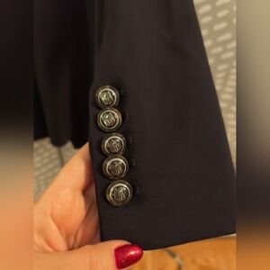 This NEW Veronica Beard x NFL Dickey Black Jacket is a stylish blazer designed for women in size 10. The jacket features a double-breasted closure with buttons, a mid-length design, and long sleeves. Made from a nylon blend outer shell fabric and polyester lining, it is suitable for casual occasions during all seasons. The black color and solid pattern make it a versatile piece that can be paired with various outfits. Perfect for anyone looking for a classic and fashionable addition to their wardrobe, this blazer from Veronica Beard is a must-have.