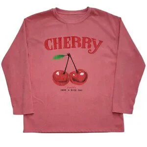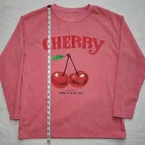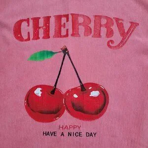 SHEIN Cherry Graphic Long Sleeve Corduroy Top Pink Pullover Drop Shoulder Small