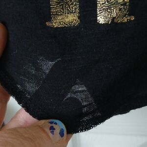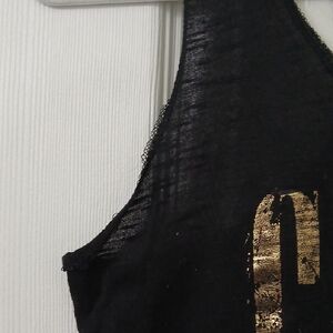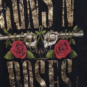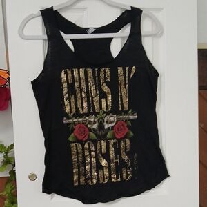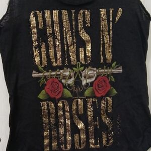 Black tank top featuring Guns N' Roses graphic with gold lettering and red roses.