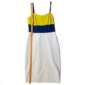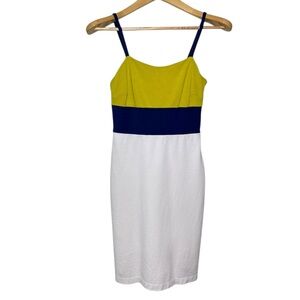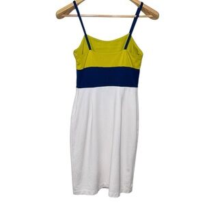 Modern Banana Republic colorblock dress featuring vibrant citron/wasabi green, navy blue, and white panels for a bold yet sophisticated look. This sleek strappy dress has a fitted bodice and flattering silhouette that works beautifully for summer events, vacations, or elevated everyday wear.