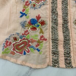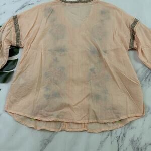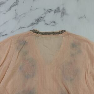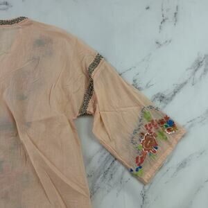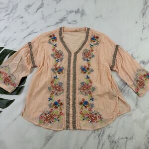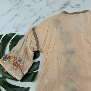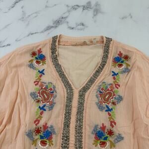 Soft Surroundings peach orange and blue floral embroidered beaded top, size M. It is free from any rips or stains. It measures about 44 inches around the bust and is about 26 inches long.