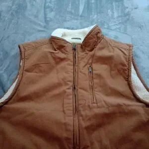Premium Select canvas workwear vest provides exceptional warmth with a full faux sherpa lining and polyester insulation. Constructed from a durable tobacco-colored cotton shell, it features a full-zip front, a vertical zippered chest pocket, and two spacious front hand pockets. The stand-up collar and dropped back hem offer extra protection against the elements, making it an ideal layering piece for outdoor work or casual rugged wear.